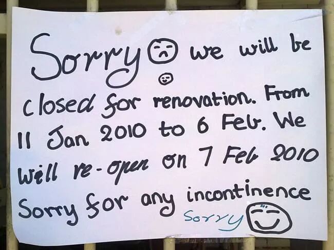 这是很正常的事情:许多独立餐厅因各种原因关闭一段时间,一些业主或厨师选择休假。这间餐厅因装修而短暂关闭。我们认为这个标志的设计者表达着“对于实际的不便,我们深表歉意!然后,他们可能会再次抱怨食物会给顾客带来实际上的尿失禁。”