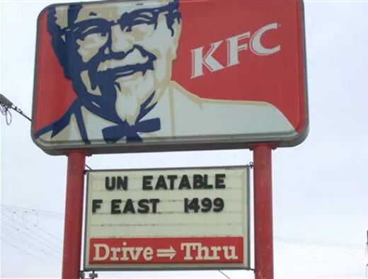 就像麦当劳一样,肯德基也是快餐店的大哥大。所以你会期望他们能够得到很正规的欢迎标志。当然,他们本意是打算在这个标志上写下“无与伦比的盛宴”。然而,它实际做的却在“无与伦比的”中遗漏了一个起决定性的字母“B”,从此成了一个笑柄。尽管如此,我们仍然会在那里吃东西,这点毫无疑问。